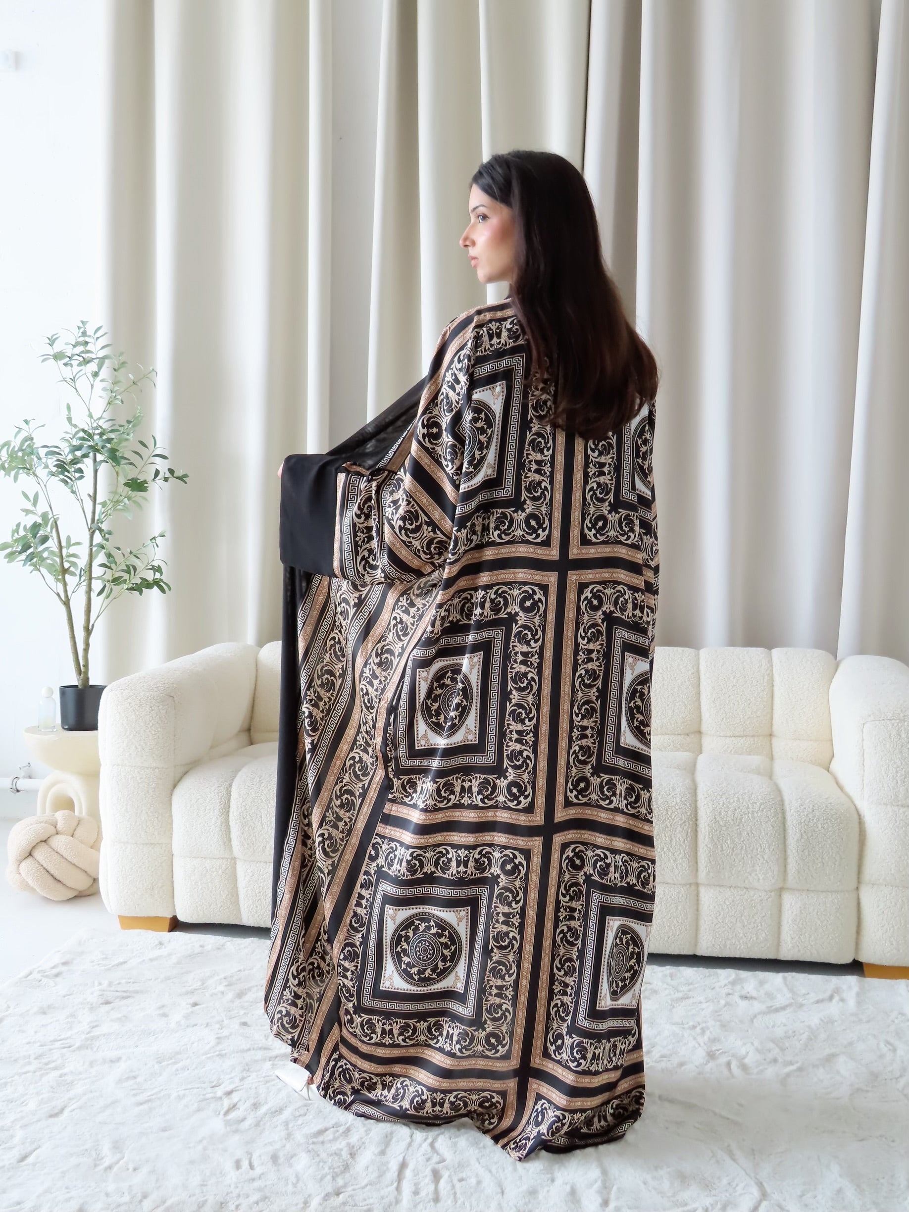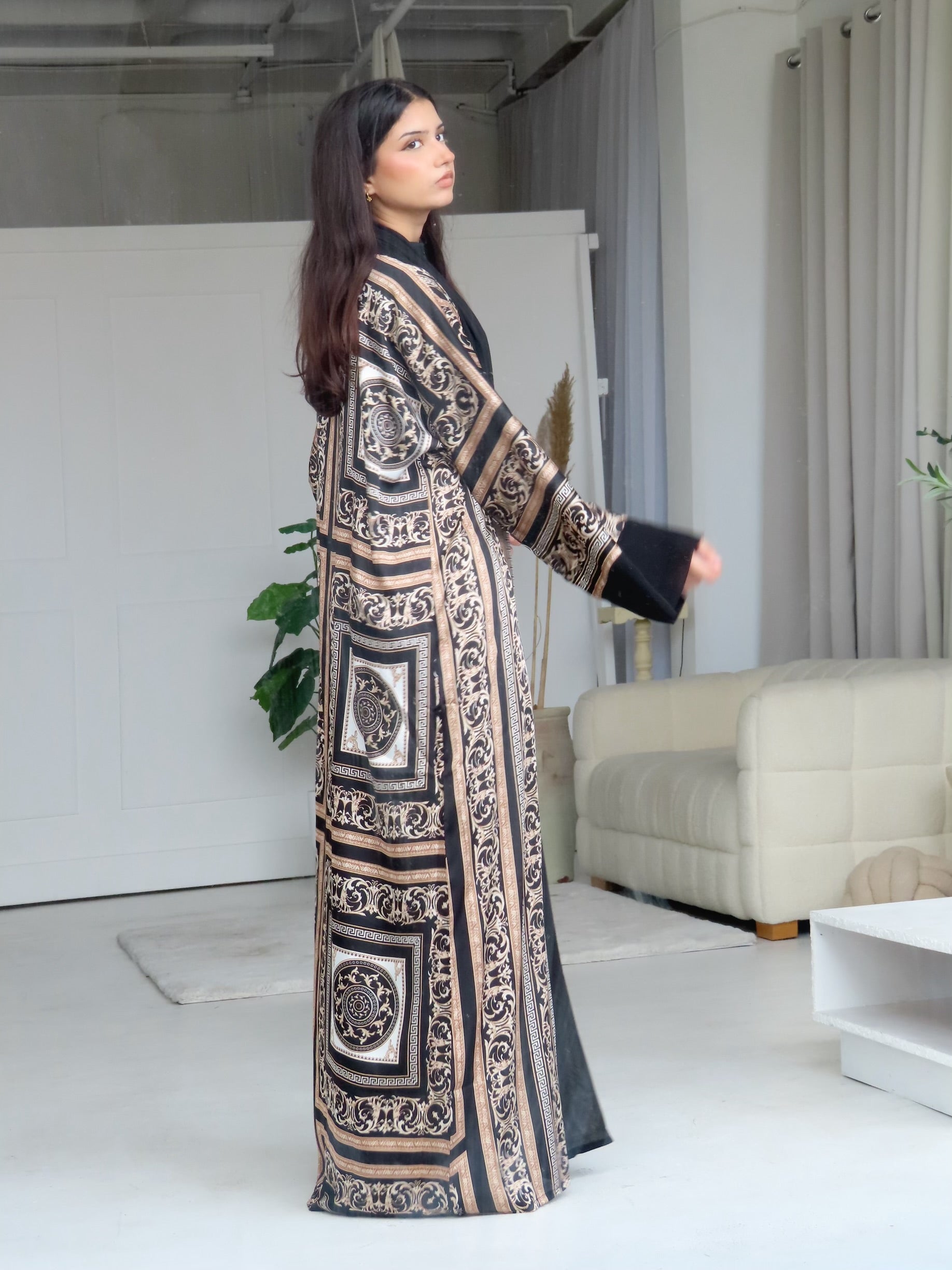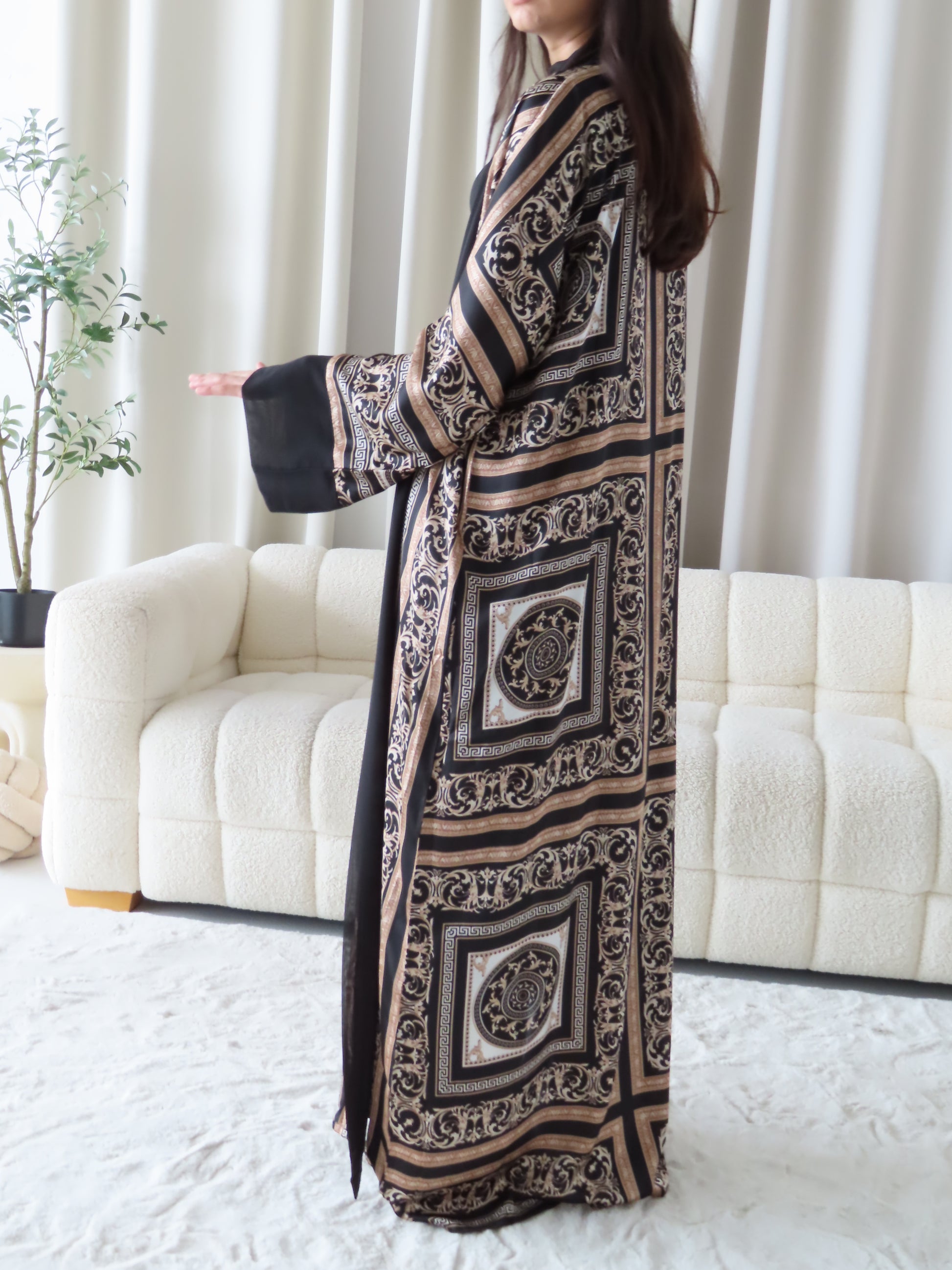 Elevate your wardrobe with the Amani 3-Piece Set, featuring a beautifully patterned abaya, matching hijab, and belt. Designed with intricate baroque-inspired detailing on a black base, this set blends elegance and modesty effortlessly—perfect for both special occasions and refined everyday wear.