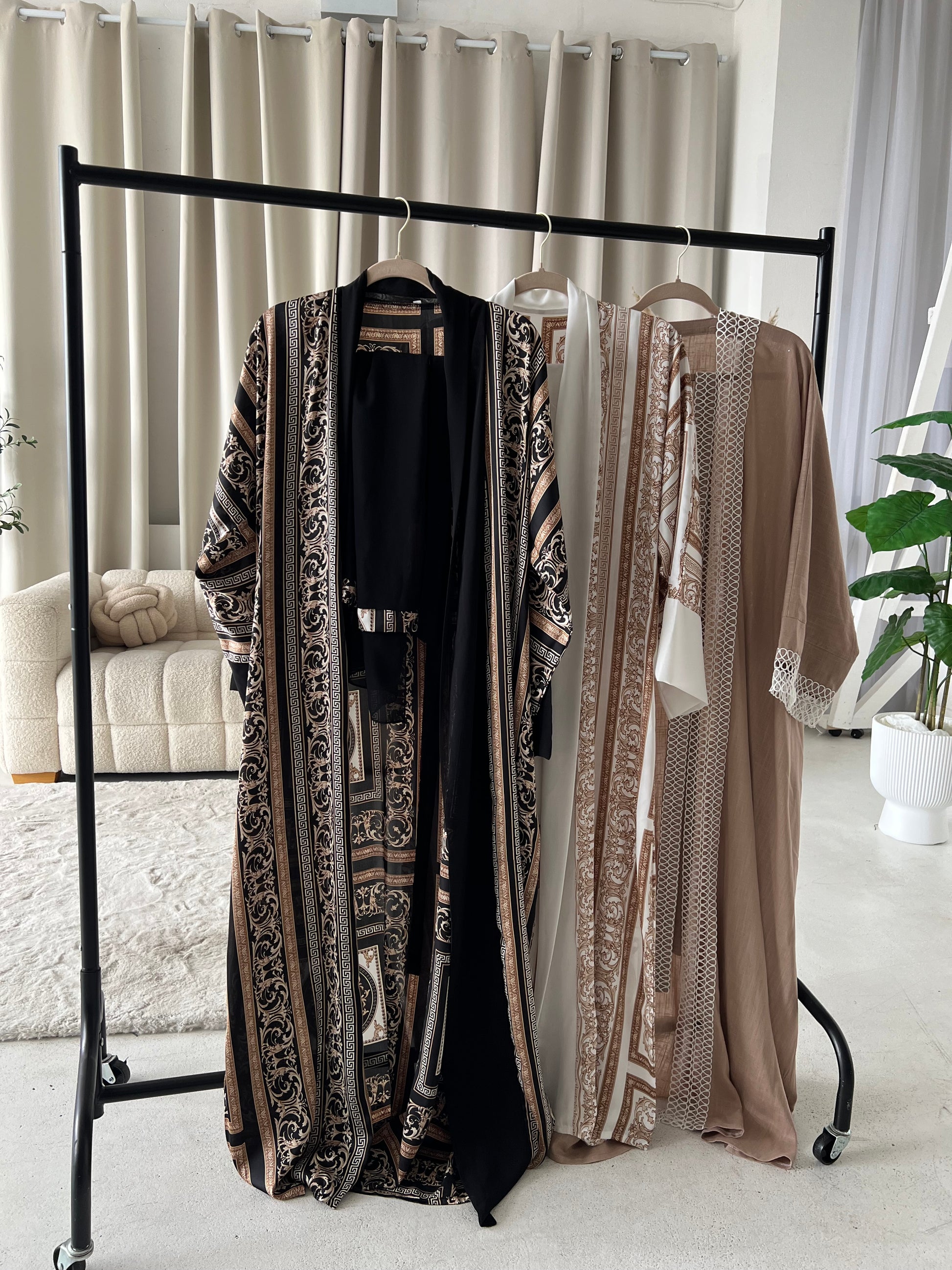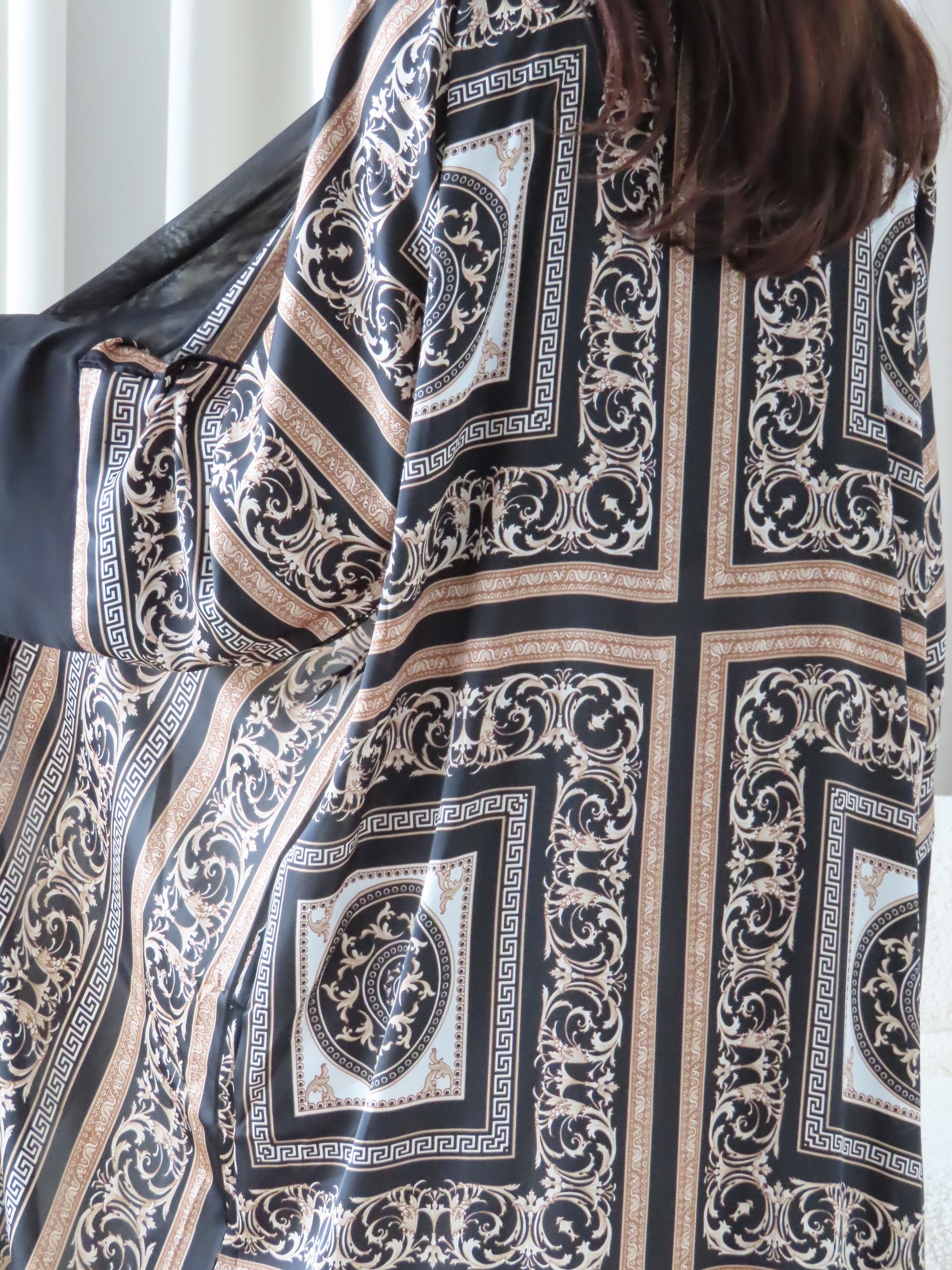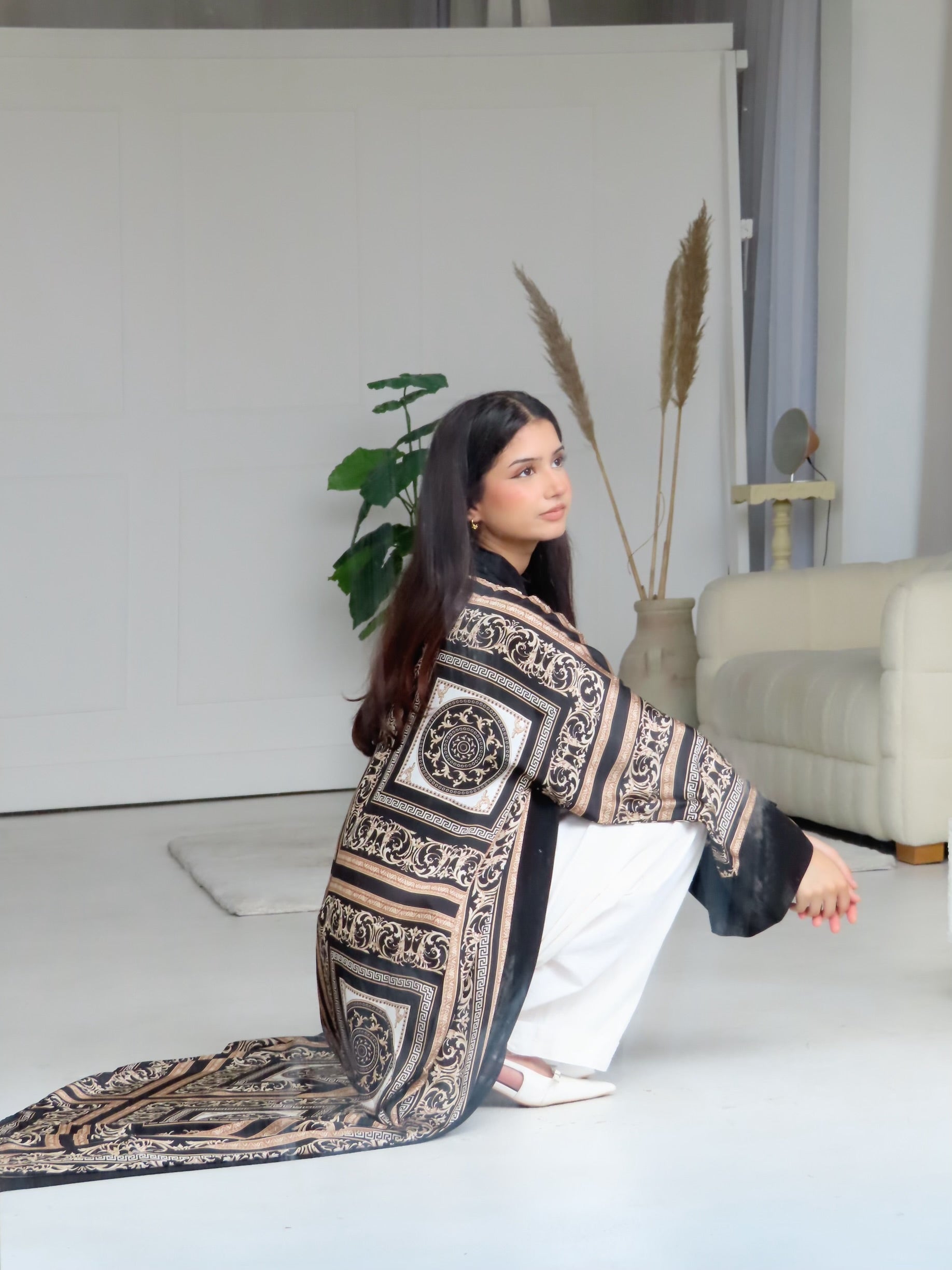 Elevate your wardrobe with the Amani 3-Piece Set, featuring a beautifully patterned abaya, matching hijab, and belt. Designed with intricate baroque-inspired detailing on a black base, this set blends elegance and modesty effortlessly—perfect for both special occasions and refined everyday wear.