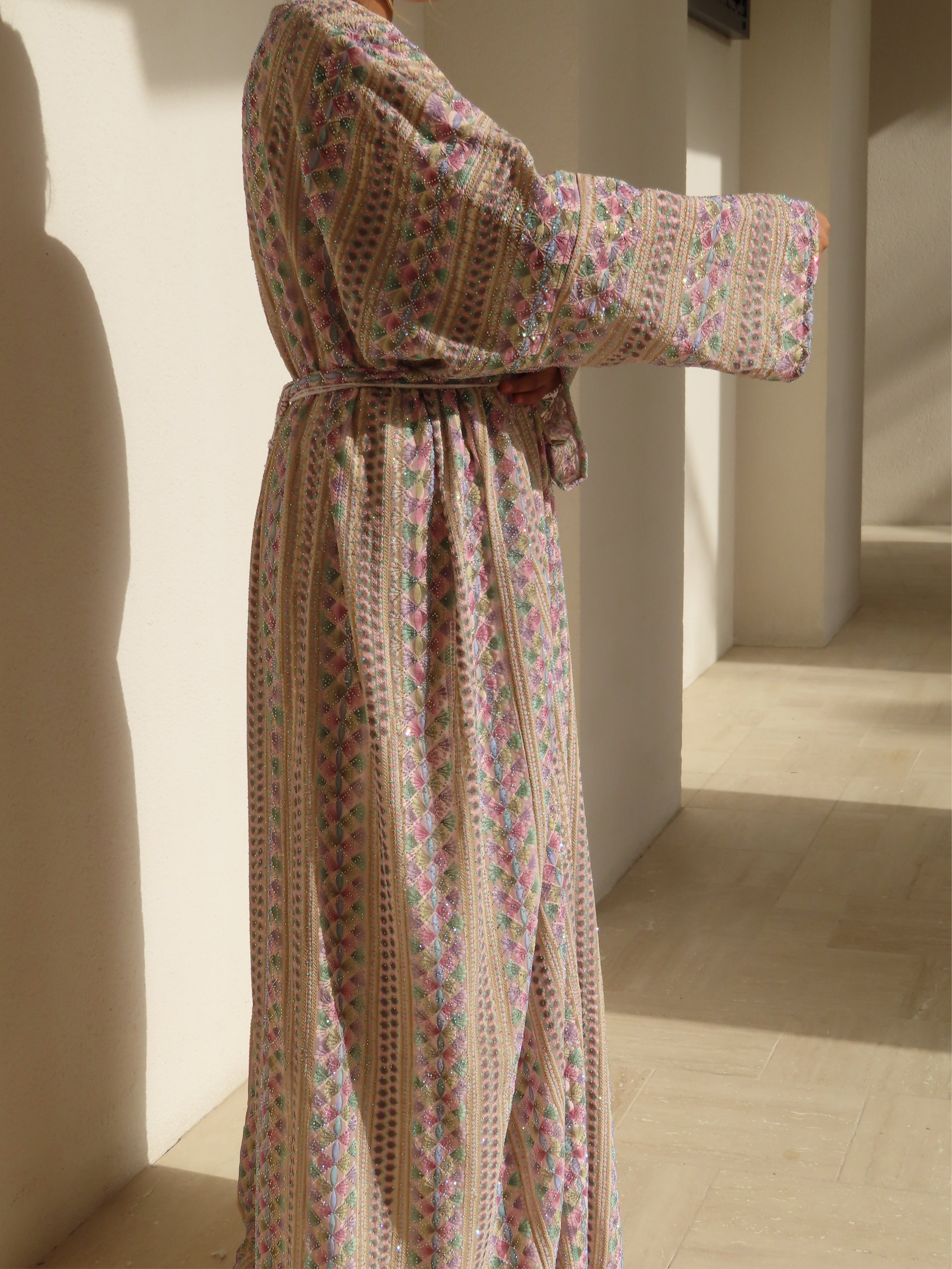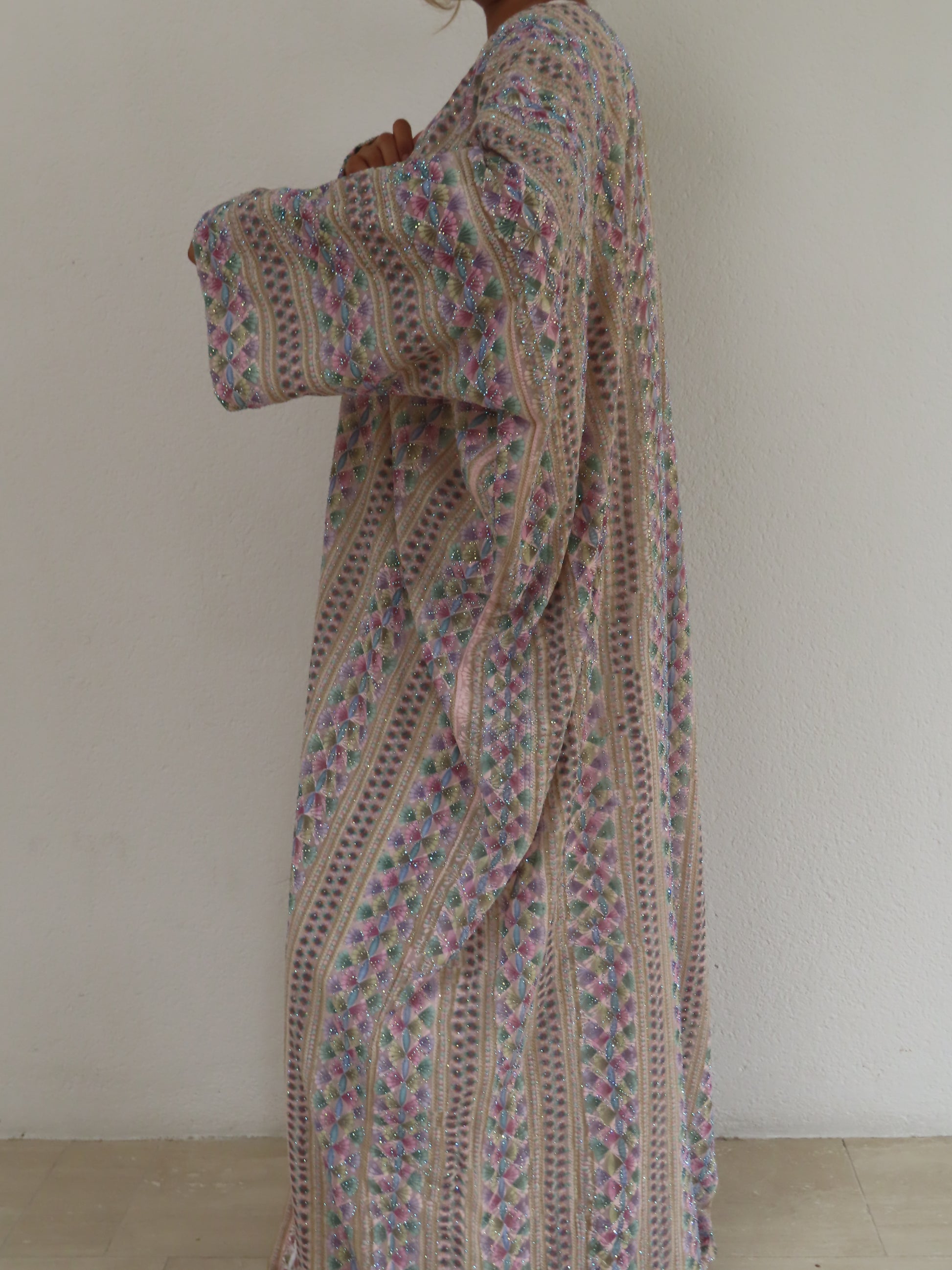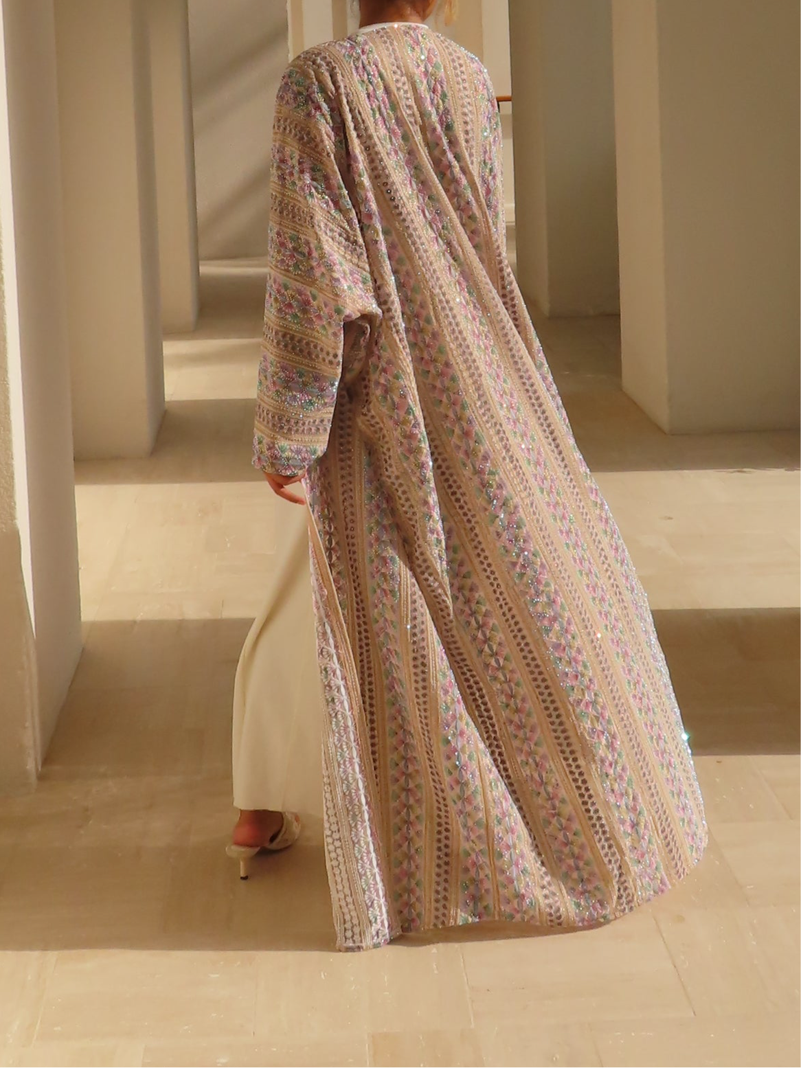 Elevate your wardrobe with this elegant long open-front abays, crafted from a lightweight fabric that drapes effortlessly. The material features a soft cream base adorned with intricate geometric and floral-inspired patterns in pastel hues of pink, lavender, mint, and beige. Its flowy silhouette makes it a versatile layering piece.