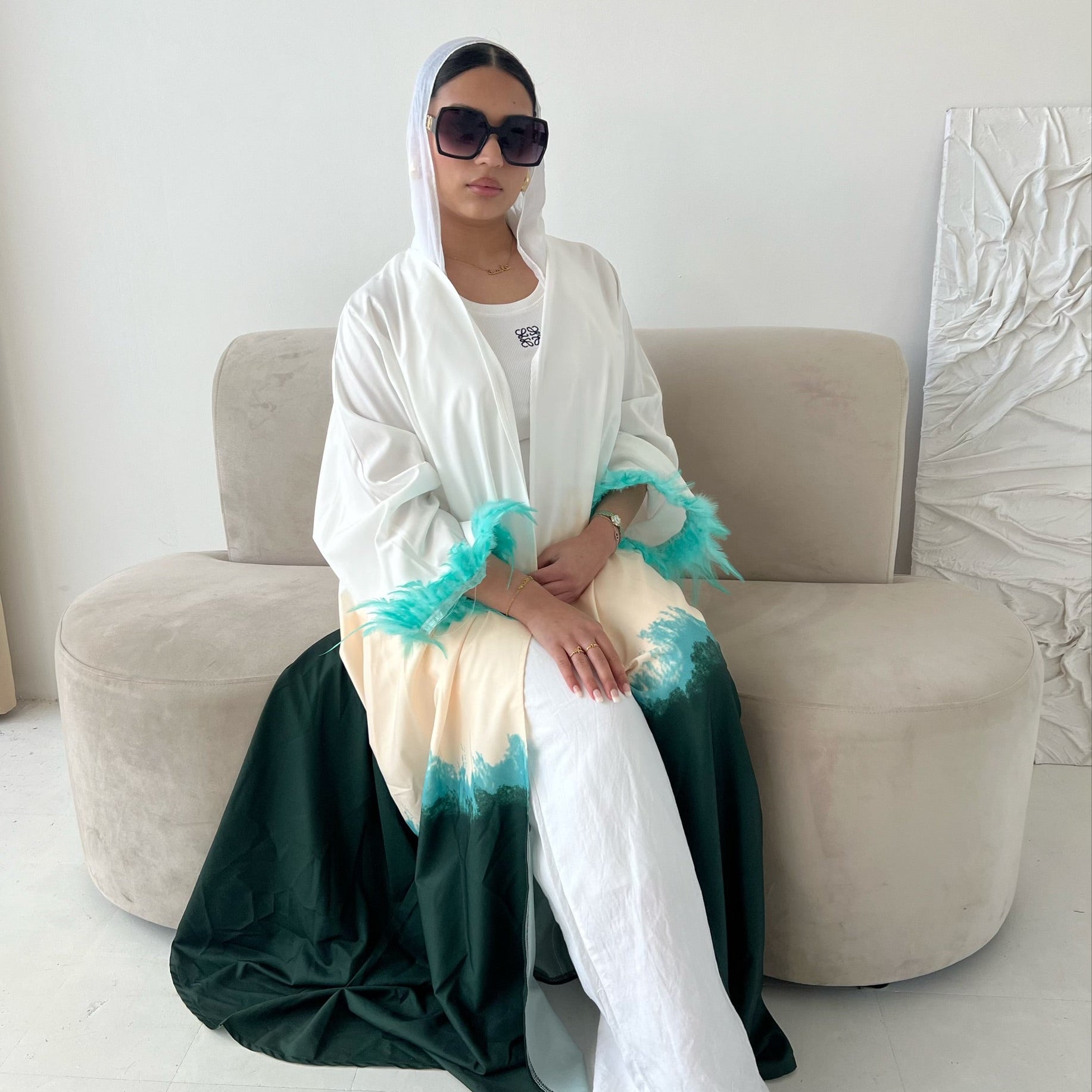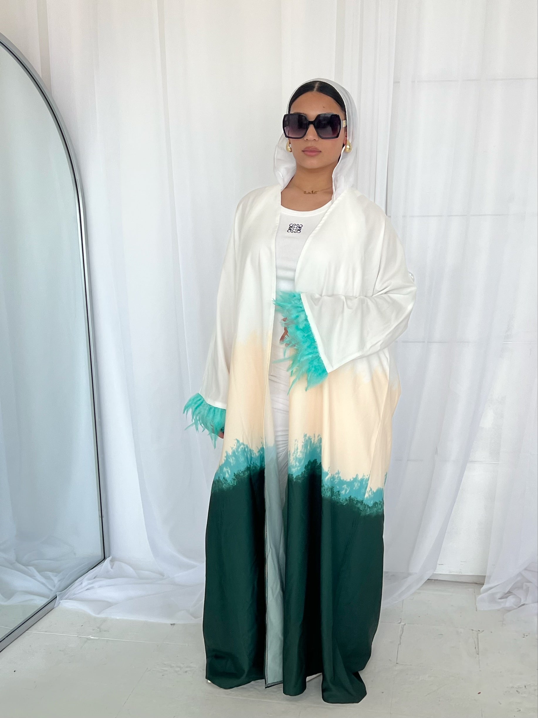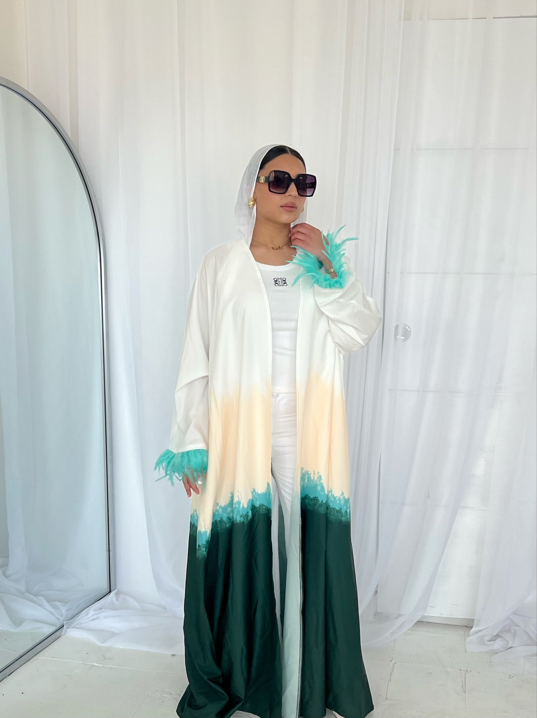 A dreamy ombré blend of white, blue, and khaki, finished with delicate feathered sleeves for a luxe touch. Flowy, lightweight, and one size, styled on a 5’5” model. Perfect for any occasion!